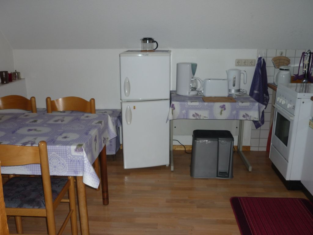 Die Küche ist mit einem Kühlschrank und Gefrierschrank, einer Spühle und einem Herd ausgestattet